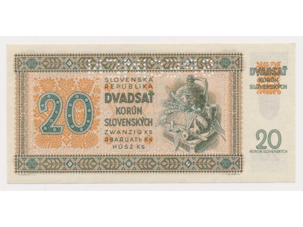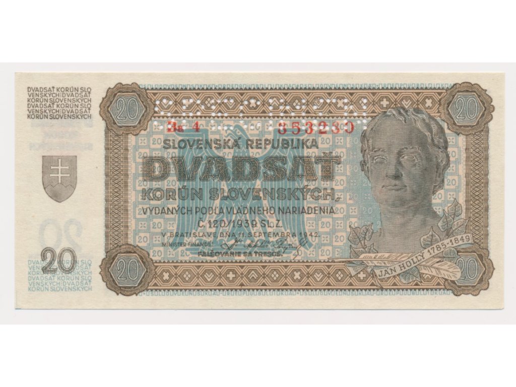 Slovenský štát, 20 Ks, 1942, série Ba 4 (jednočíselná !), perforovaná, luxusní sběratelská jakost UNC