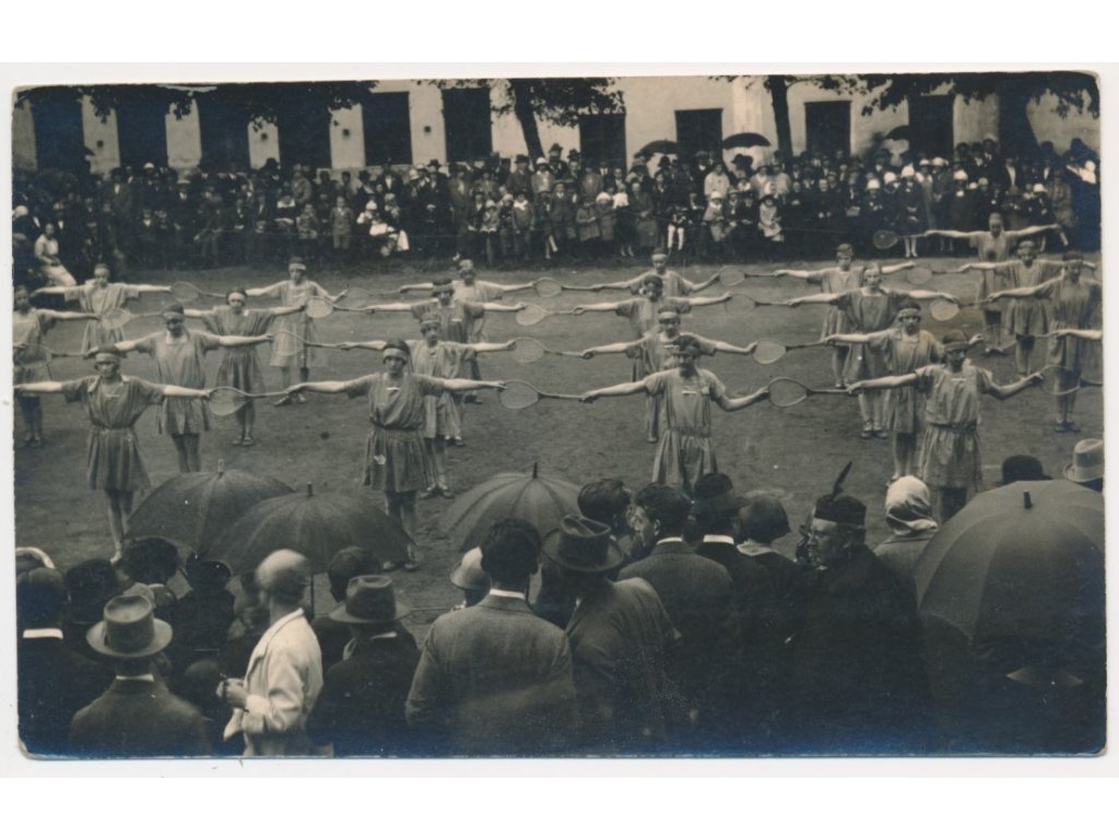Sokol, cvičení žen s tenisovými raketami, cca 1910