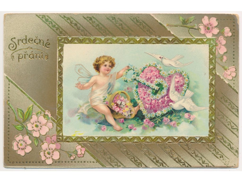 Srdečné přání, zlacená koláž s andělíčkem, cca 1912