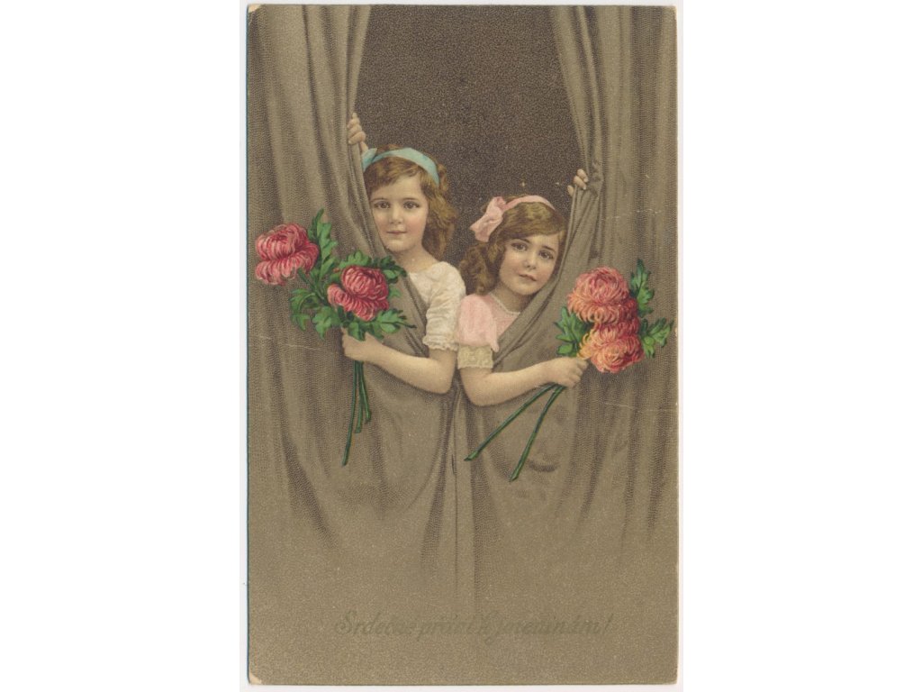 Srdečné přání k jmeninám, dívky s květinami, cca 1920