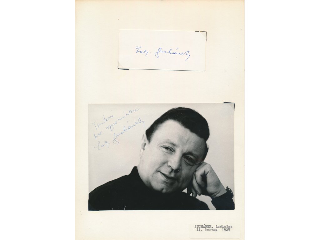 Suchánek Ladislav (1925-2001), český herec, sběratelský list o velikosti A4 s portrétovou fotografií o rozměrech cca 14x18cm s věnováním a vlastnoručním podpisem a s vlastnoručním podpisem na sběratelské kartičce...viz autentické foto