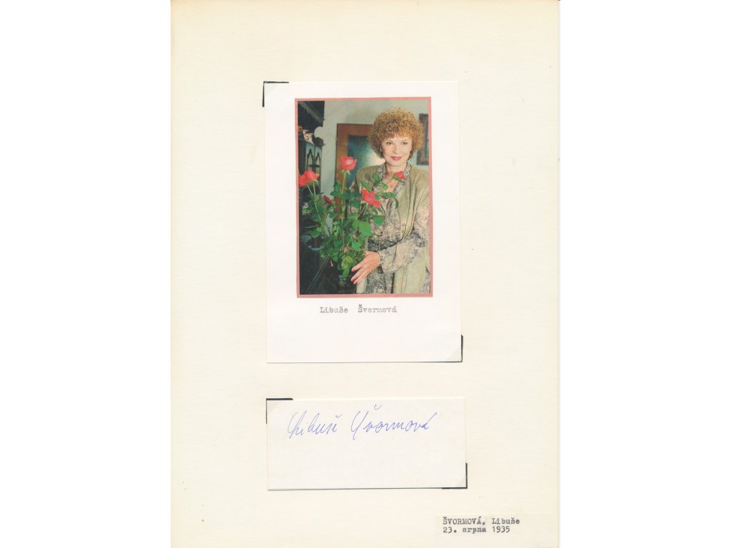 Švormová Libuše (1935), česká herečka, sběratelský list o velikosti A4 s výstřižkem fotografie z časopisu a vlastnoručním podpisem na sběratelské kartičce...viz autentické foto
