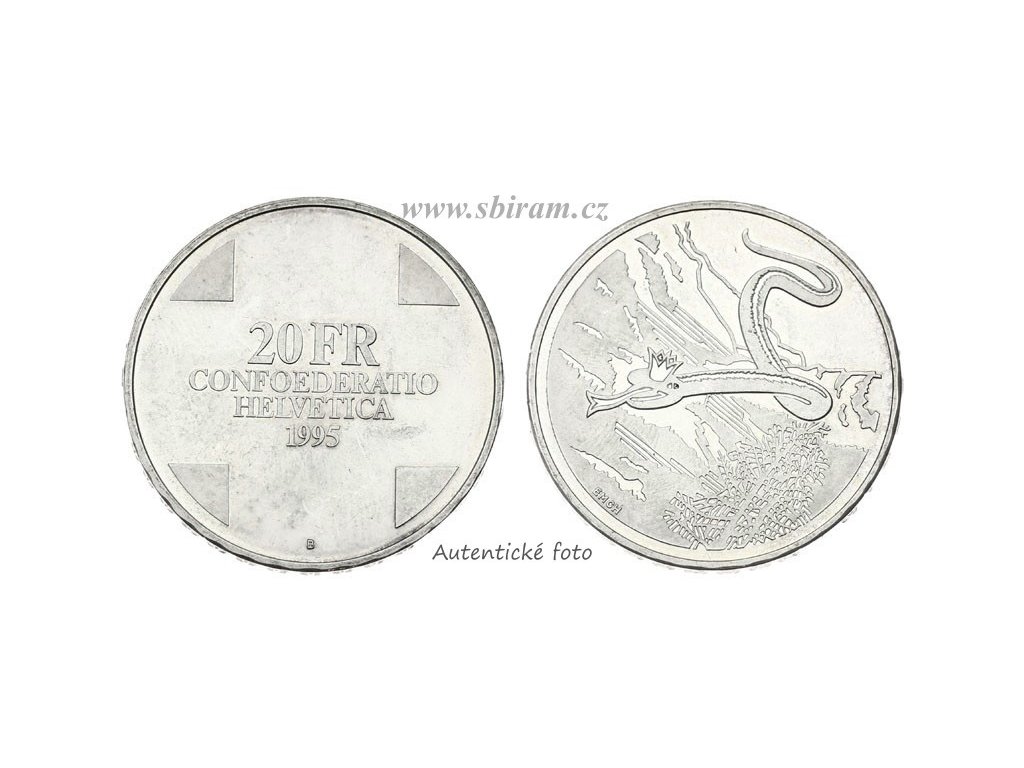 Švýcarsko, Ag (stříbrná) mince 20 Franků, 1995, Bílá hadí královna...autentické foto