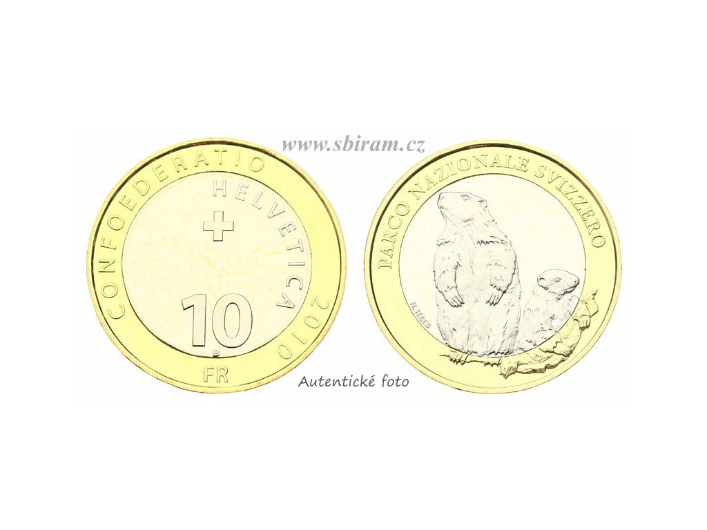 Švýcarsko, pamětní mince 10 Franků, 2010, Švýcarský národní park – Alpine Marmo...viz autentické foto