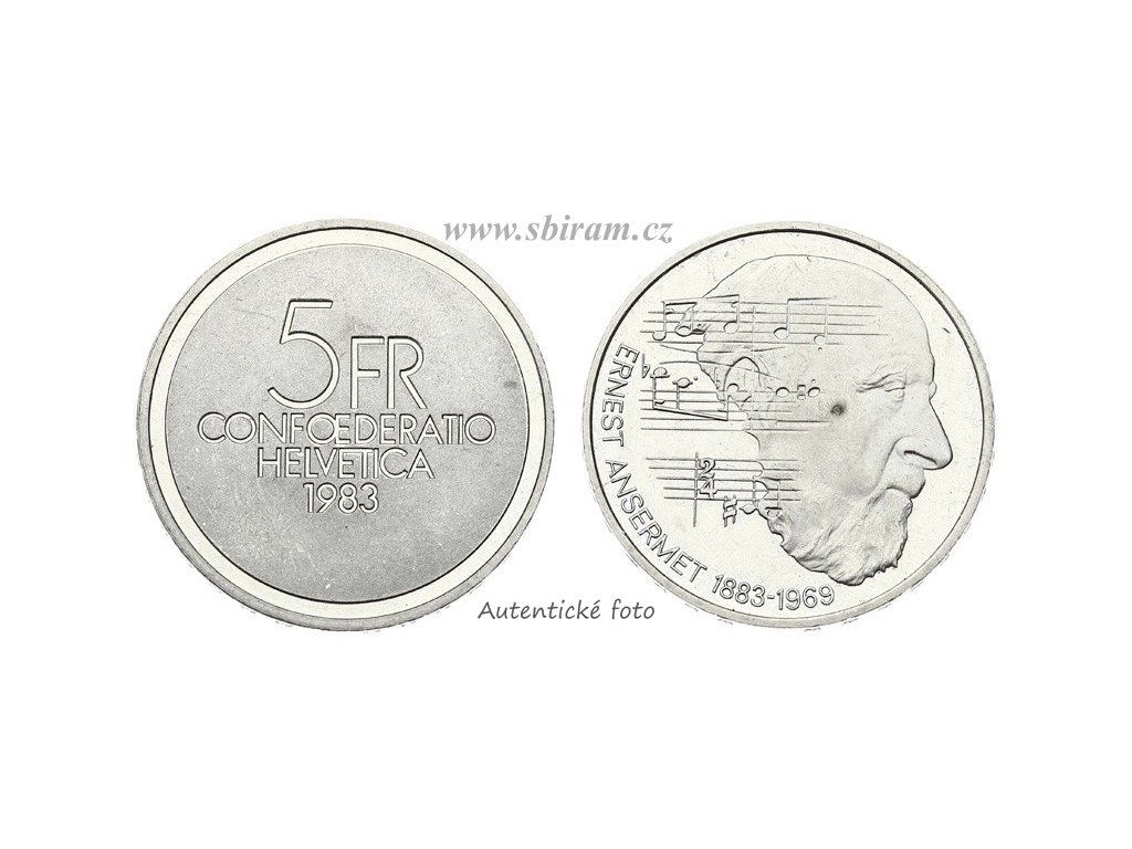 Švýcarsko, pamětní mince 5 Franků, 1983, 100. výročí narození Ernesta Ansermeta...viz autentické foto