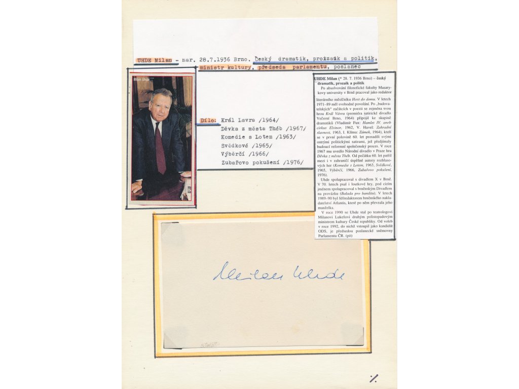 Uhde Milan (1936), spisovatel, politik, sběratelský list o velikosti A 4 s novinovým výstřižkem, sběratelskou kartou a vlastnoručním podpisem...viz autentické foto