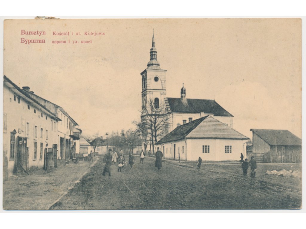 Ukrajina, Burštyn, oživená ulice u kostela, cca 1908
