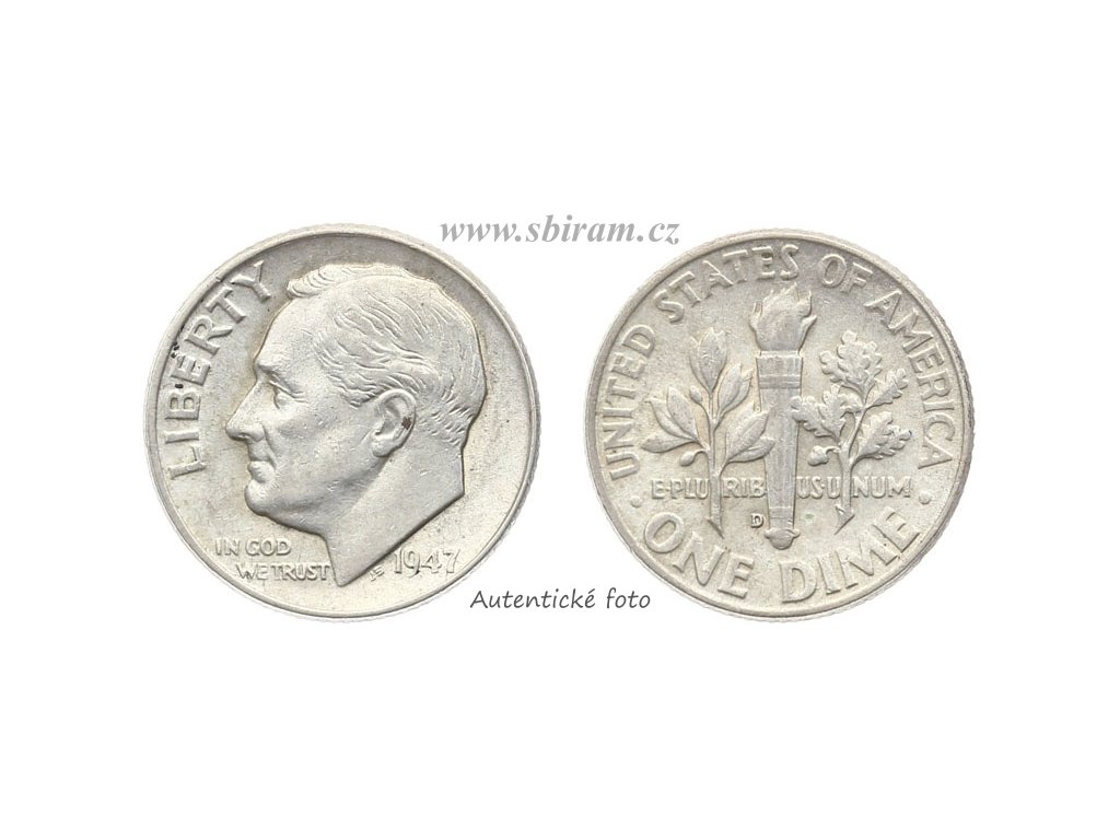 USA, Ag (stříbrná) mince 1 Dime, 1947 D...viz autentické foto