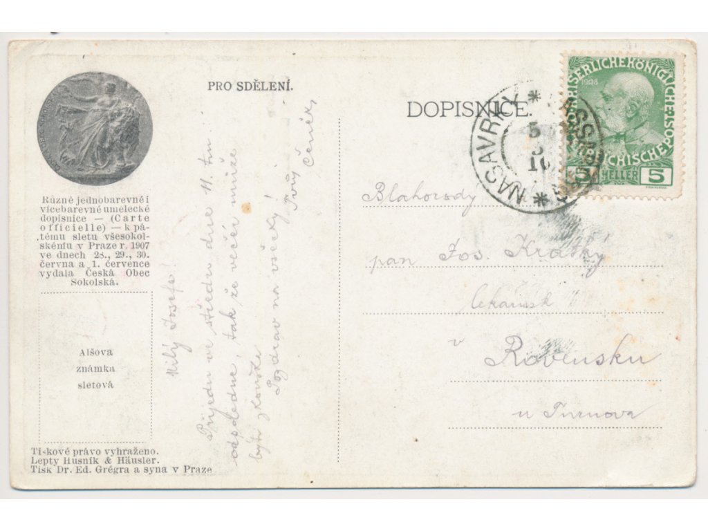 V. slet všesokolský v Praze, oficiální pohlednice, 1907