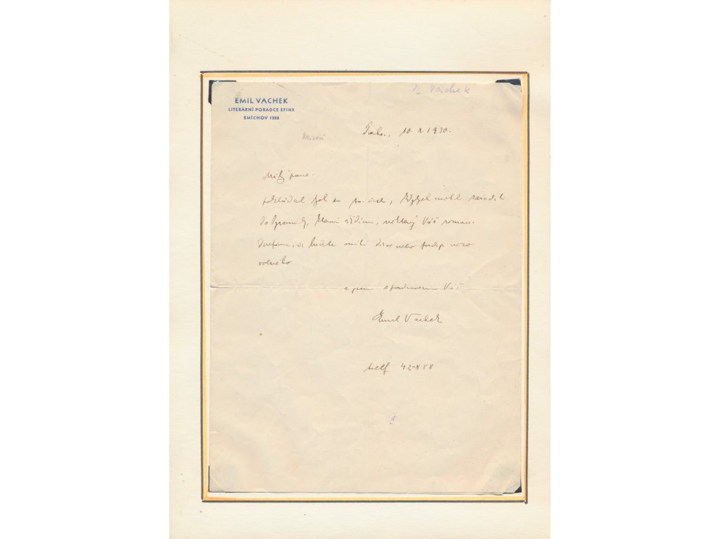Vachek Emil (1889-1964), spisovatel, sběratelský list s dopisem a vl. podpisem