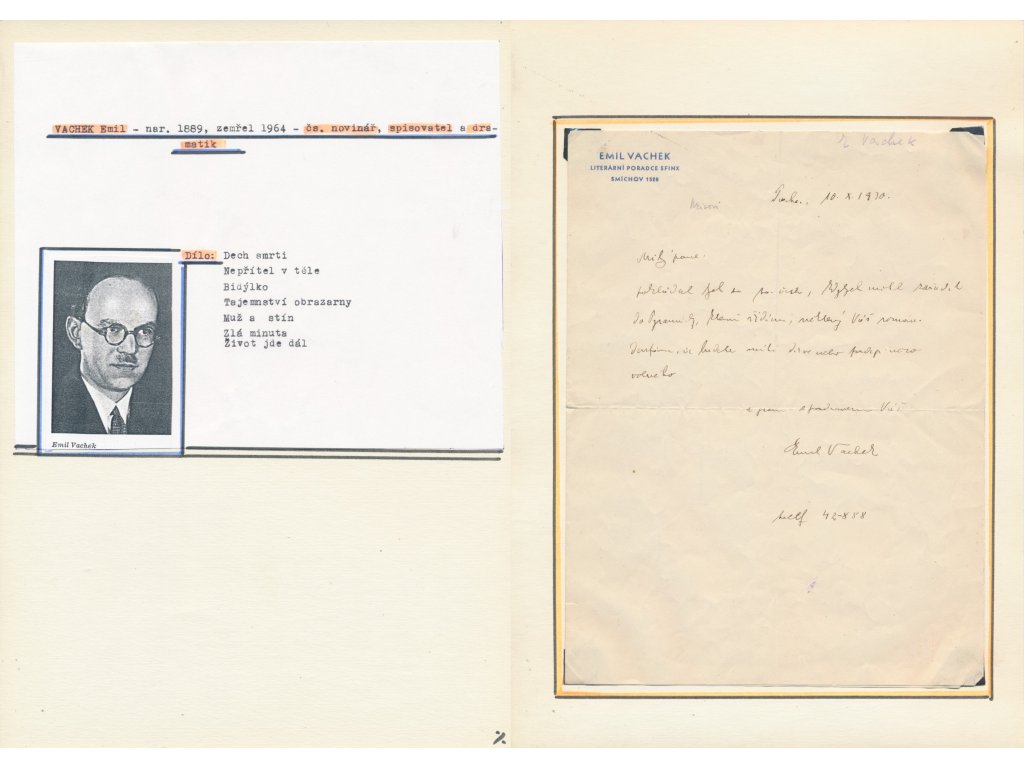 Vachek Emil (1889-1964), český spisovatel, novinář, dramatik, sběratelský list o velikosti A 4 s dopisem a vlastnoručním podpisem...viz autentické foto