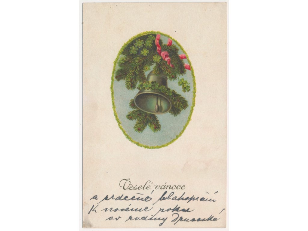 Vánoční koláž, zvoneček, větvičky ze stromečku, čtyřlístky, cca 1918