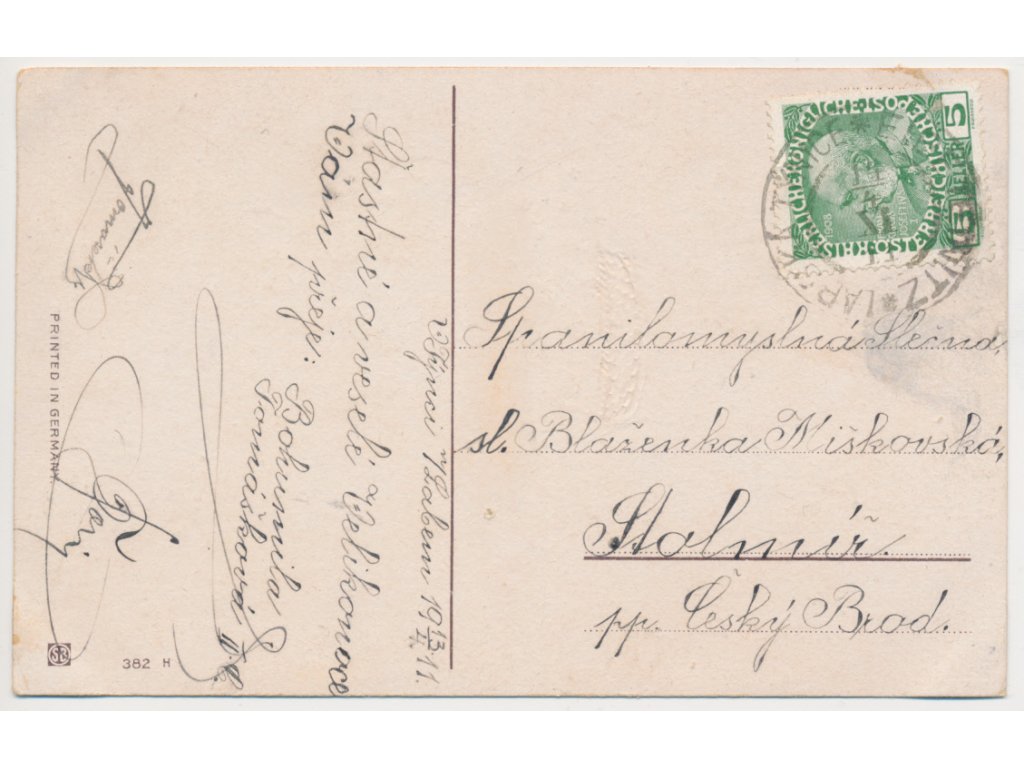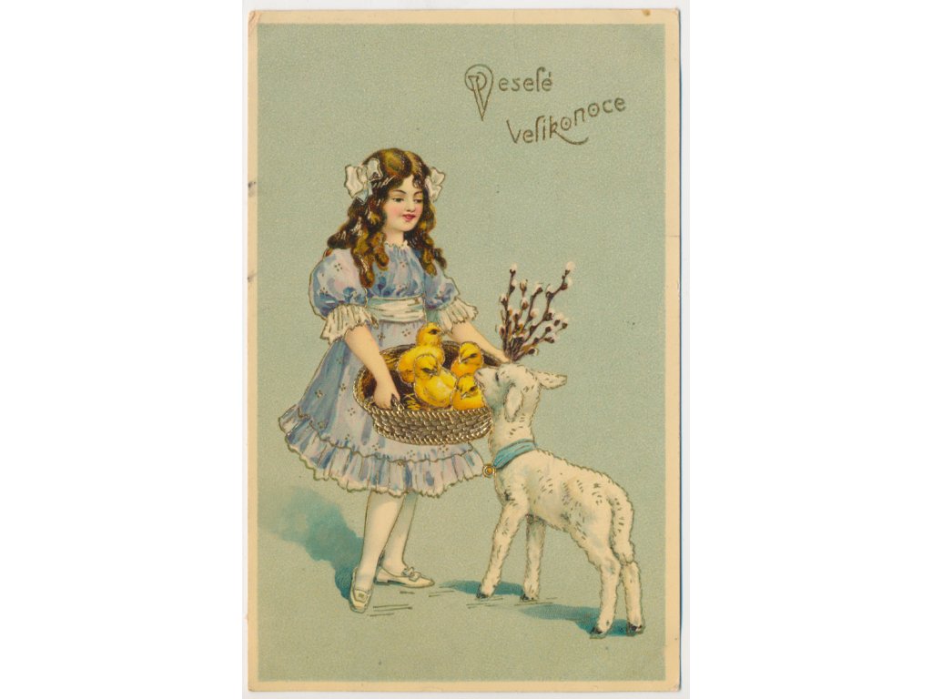 Velikonoční přání, Zlacená koláž dívky s kuřátky a jehňátkem, cca 1911