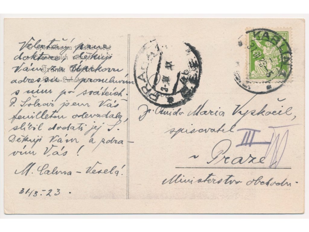 Veselá - Calma Marie (1881-1966), spisovatelka, operní pěvkyně, sběratelský list s bromostříbrnou pohlednicí (foto Drtikol) s vl. podpisem