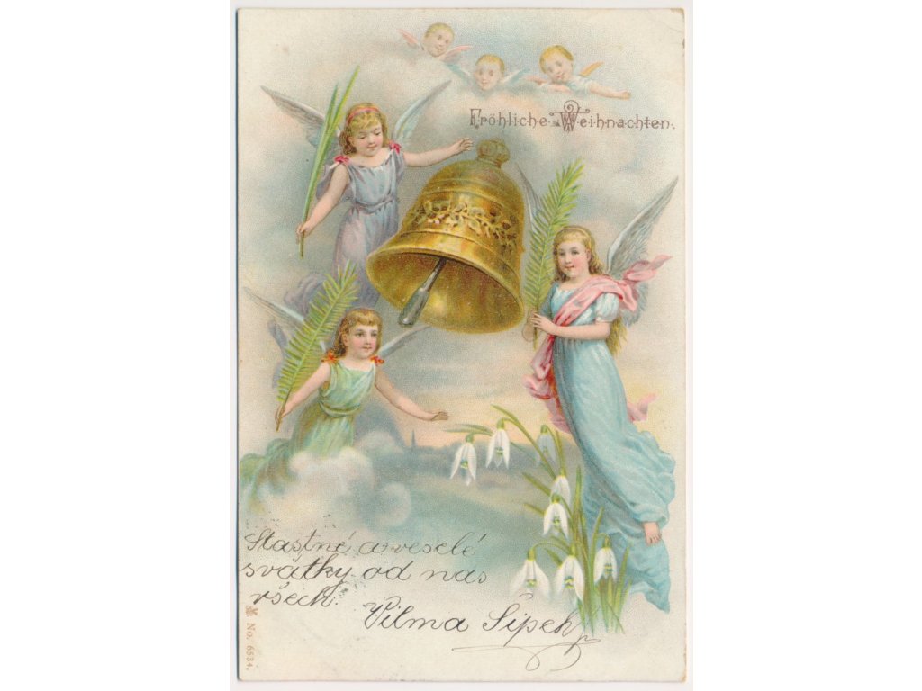 Veselé Vánoce, Zlacená litografická koláž s anděly, cca 1899