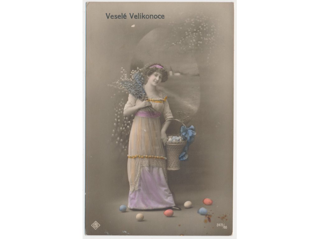 Veselé Velikonoce, dívka s košíkem, barevné vejce, cca 1913