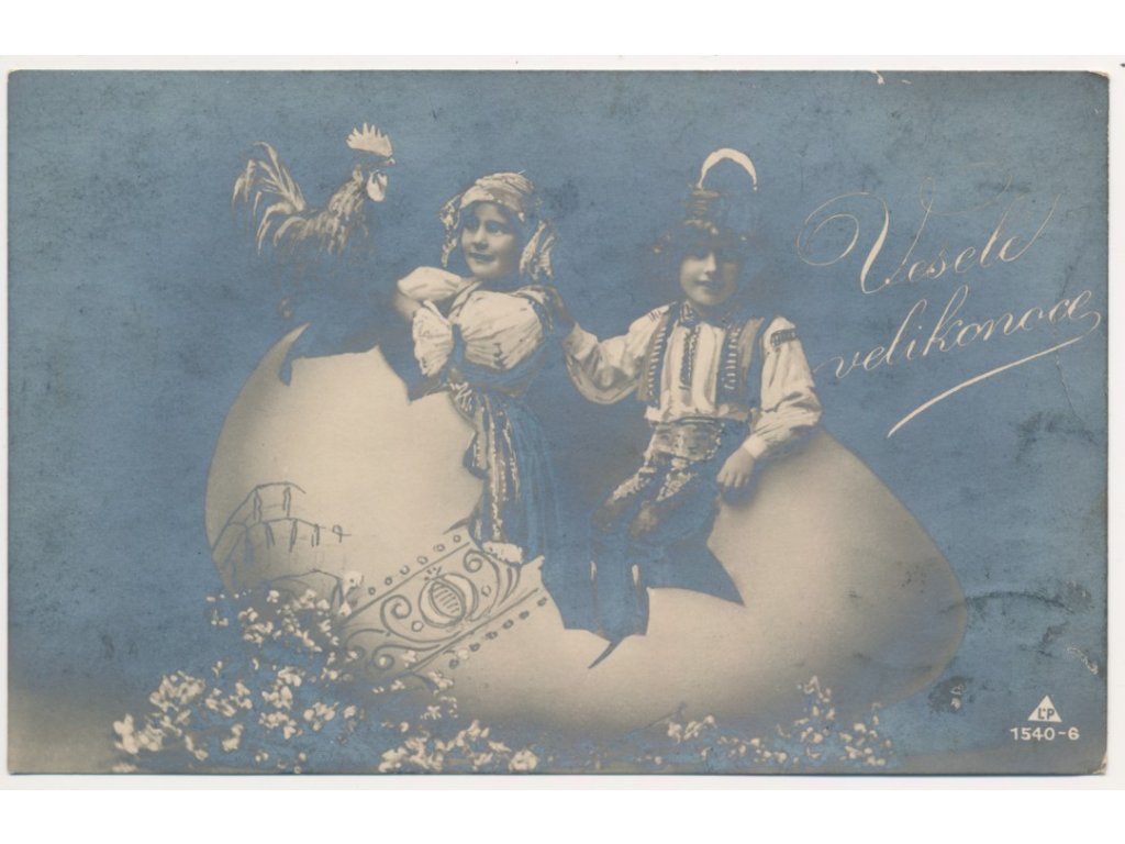 Veselé Velikonoce, Koláž, děti v kroji, kraslice, kohout..., cca 1920