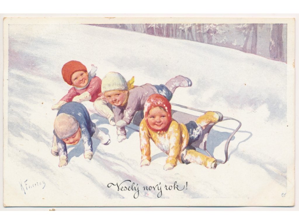 Veselý Nový rok, Děti, sníh, sáňky..., cca 1912