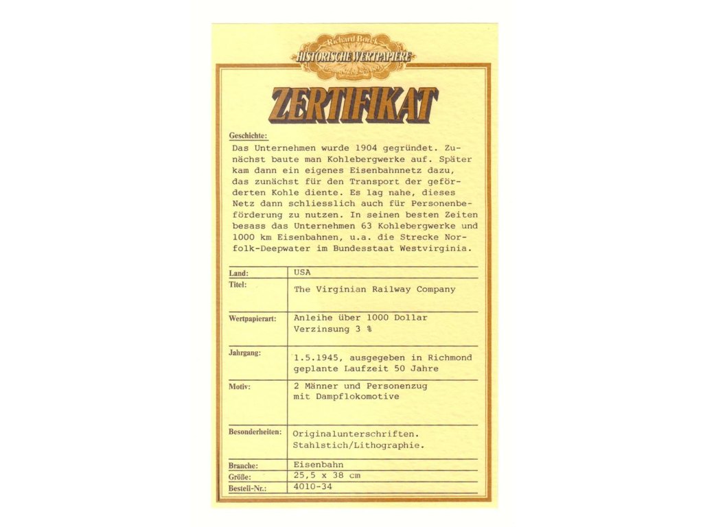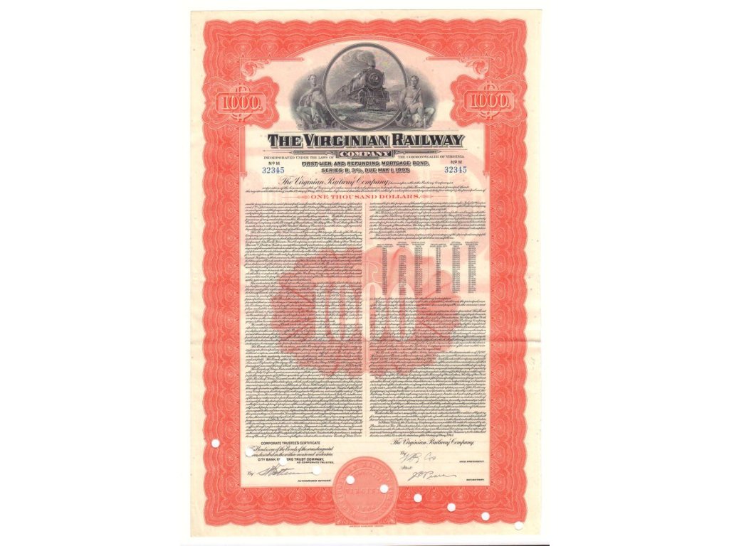 Virginia, The Virginian Railway Company, akcie $1000 - železnice, 1945, rozměr 380x255mm, certifikát pravosti firmy Richard Borek přiložen, všechny náležitosti, krásná zachovalost 1