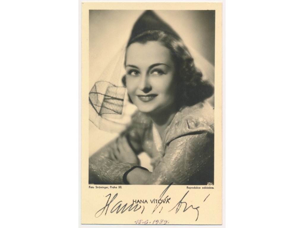 Vítová Hana (1914-1987), česká herečka, portrétová pohlednice (foto Ströminger) o rozměrech cca 9x14cm s vlastnoručním podpisem (datováno 1939)...viz autentické foto
