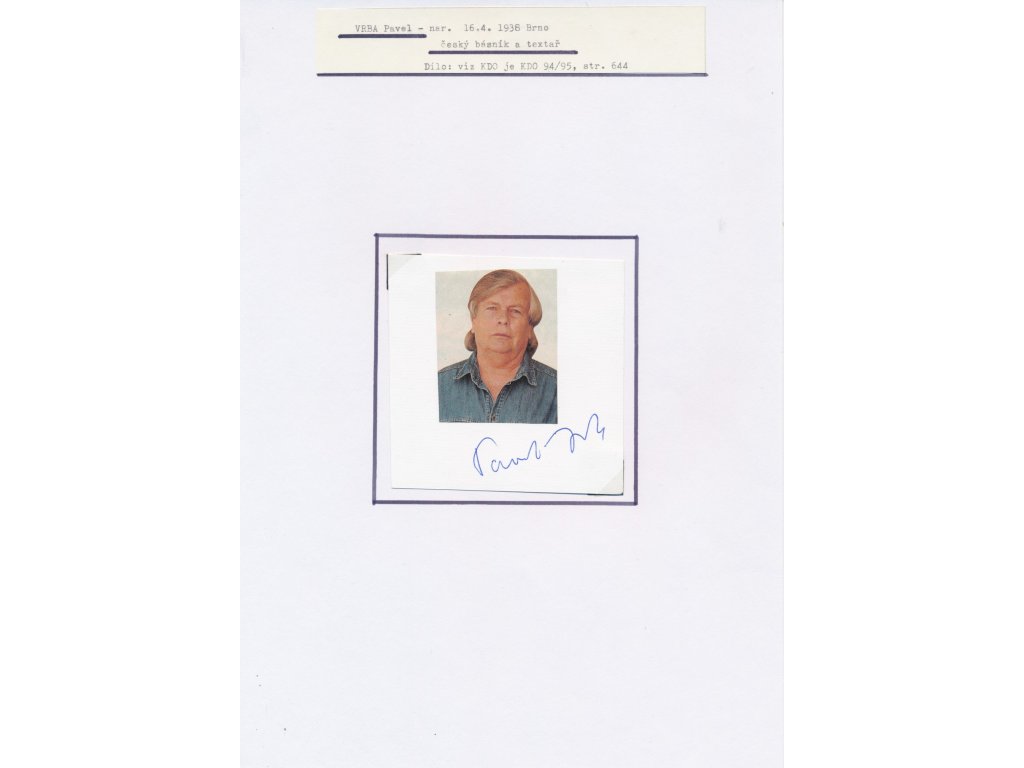 Vrba Pavel (1938-2011), český básník, textař, sběratelský list o velikosti A 4 s novinovým výstřižkem, sběratelskou kartou a vlastnoručním podpisem...viz autentické foto